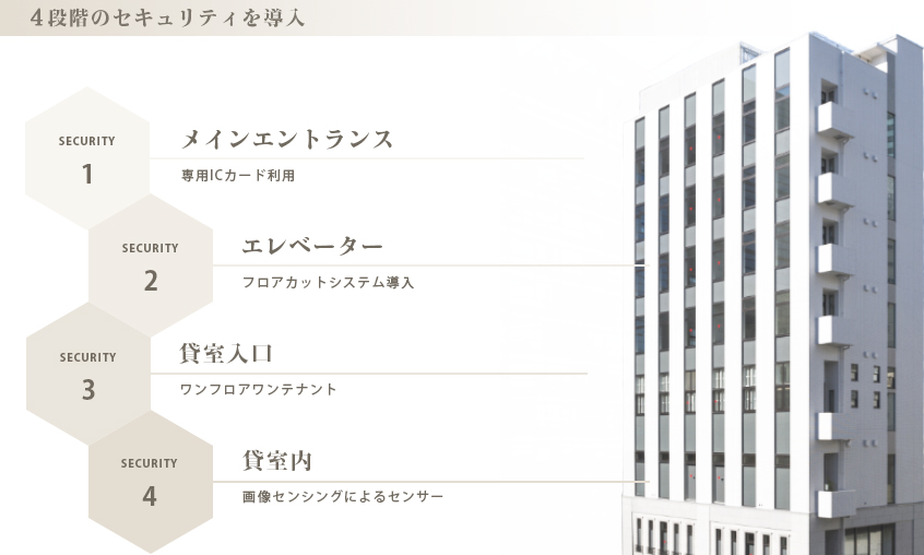 24時間365日体制で入居テナントのプライバシーを保持し、不審者の侵入を防ぎます。